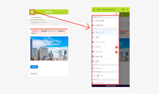 「マイページ」画面右上のメニューからも、日報の記入や閲覧、コミュニティの投稿や閲覧が可能です。