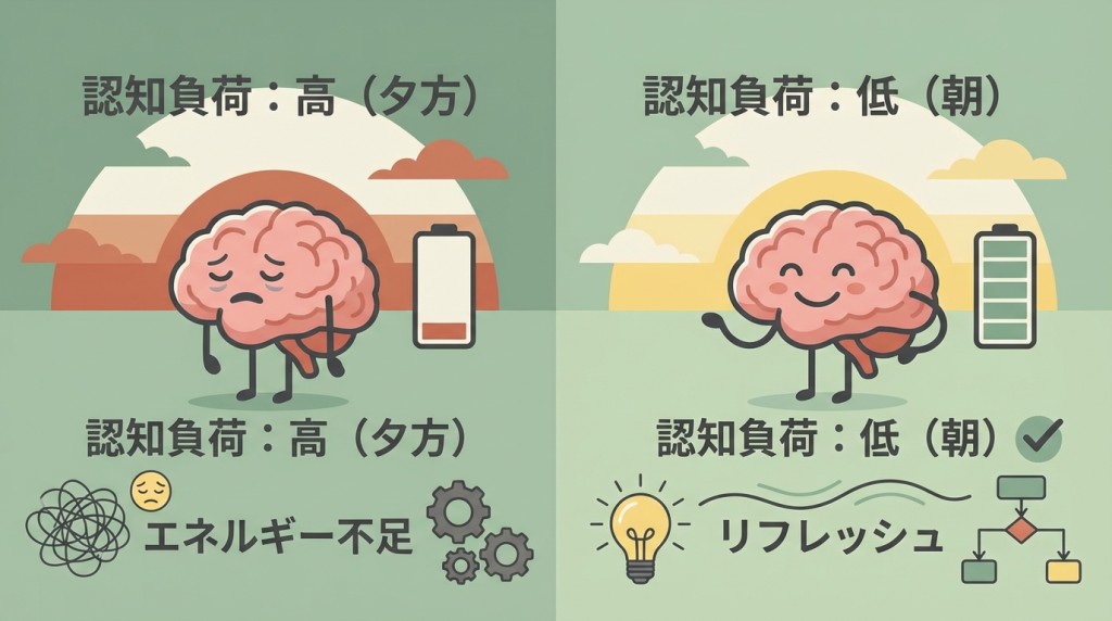 さらに、出勤直後という「環境の切り替わり」がトリガーとなって、ルーティン化もしやすいのです。一方、夕方は判断疲れに加えて「早く帰りたい」という心理も働き、二重に負荷がかかります。