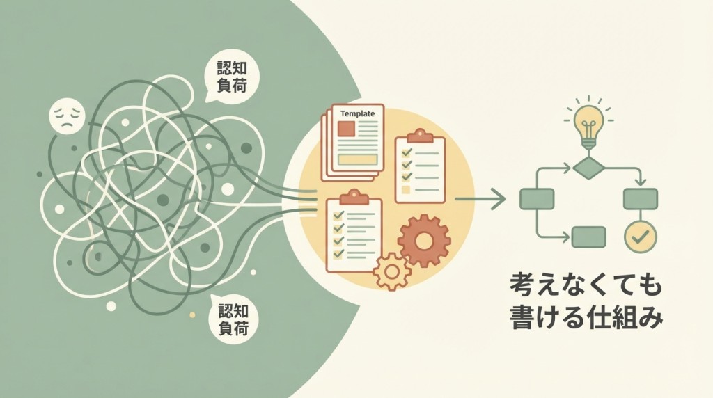 本当に必要なのは、「考えなくても書ける仕組み」を作ること。認知負荷を下げる工夫にはこんなものがあります。